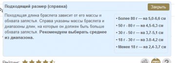 Відповідна довжина браслета залежить від його маси і обхвату зап'ястя. Справа вказані маси браслета і діапазони довжин, на які він повинен бути більше обхвату зап'ястя. - Більше 80 г - на 5,0-6,6 см